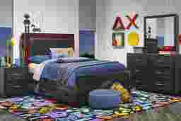 With an industrial-inspired look that levels up your loved one's space, the Carbon Optix full bed delivers the ultimate style for game time. Crafted in a high gloss, black lacquered finish, the bed features a headboard upholstered with contemporary high-performance fabric that has the texture of carbon fiber. An epic array of integrated multifunctional, multicolor remote-controlled LED lights glow, strobe and beam to stunning effect with the remote control. The left side of the headboard features touch sensor power for the lights and dual USB-A ports for charging electronic devices. The headboard's side storage panels provide the perfect space for stashing away headphones and controllers. A panel footboard with neat framing completes the sleek look. Mattress and foundation (if required) sold separately. Reversible underbed storage drawers sold separately.