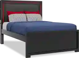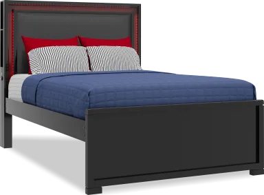 With an industrial-inspired look that levels up your loved one's space, the Carbon Optix full bed delivers the ultimate style for game time. Crafted in a high gloss, black lacquered finish, the bed features a headboard upholstered with contemporary high-performance fabric that has the texture of carbon fiber. An epic array of integrated multifunctional, multicolor remote-controlled LED lights glow, strobe and beam to stunning effect with the remote control. The left side of the headboard features touch sensor power for the lights and dual USB-A ports for charging electronic devices. The headboard's side storage panels provide the perfect space for stashing away headphones and controllers. A panel footboard with neat framing completes the sleek look. Mattress and foundation (if required) sold separately. Reversible underbed storage drawers sold separately.