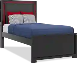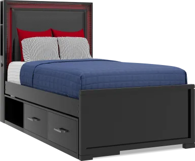 With an industrial-inspired look that levels up your loved one's space, the Carbon Optix twin bed delivers the ultimate style for game time. Crafted in a high gloss, black lacquered finish, the bed features a headboard upholstered with contemporary high-performance fabric that has the texture of carbon fiber. An epic array of integrated multifunctional, multicolor remote-controlled LED lights glow, strobe and beam to stunning effect with the remote control. The left side of the headboard features touch sensor power for the lights and dual USB-A ports for charging electronic devices. The headboard's side storage panels provide the perfect space for stashing away headphones and controllers. A panel footboard with neat framing completes the sleek look. Mattress and foundation (if required) sold separately. Reversible underbed storage drawers sold separately.