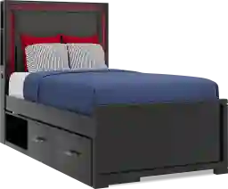 Level up your loved one's space with the industrial-inspired look of the Carbon Optix twin storage bed. Crafted in black lacquered finish, the bed features a headboard upholstered with contemporary high-performance fabric that has the texture of carbon fiber. Integrated multifunctional, multicolor remote-controlled LED lights glow, strobe and beam to stunning effect with the remote control. The headboard's left side features a touch sensor power button for the lights and dual USB-A ports for charging. Additional side compartments are awesome for quickly stashing away headphones and controllers. Both underbed storage cubbies are reversible and each feature a pair of drawers constructed with English dovetail joints in the front alongside dust proof bottoms. Custom pewter drawer pulls have a diamond pattern texture with a look and feel inspired by motorbike levers. The panel footboard with neat framing completes the sleek look. Mattress and foundation (if required) sold separately.
