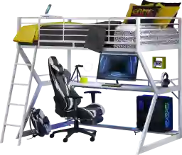 With an industrial-inspired look that levels up your loved one's space, the white Carbon Optix full gaming loft delivers the ultimate convenience for game time. Constructed from powder coated metal, this loft features a desk that has remote-controlled red, blue, purple, and green lights, or an epic combination of them all. Interchangeable and versatile, the included three-piece accessory kit features a short shelf that can be used as a nightstand, a hook for headphones and a shelf perfect for a gaming CPU. These accessories can be attached to the lower rail, side rail, guard rail or rail behind the desk. Mattress and foundation sold separately. This product requires a bunkie board (sold separately).