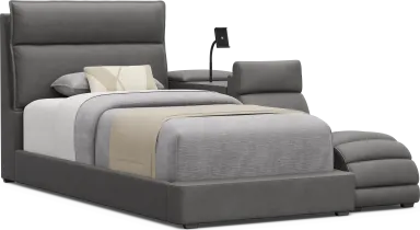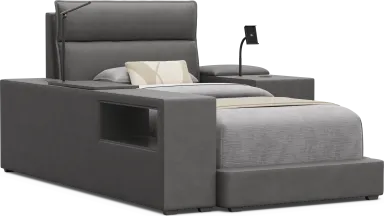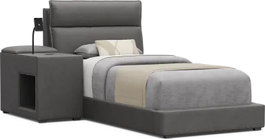 Your forecast calls for a 100% chance of style and super smart bedroom design when you bring the Cloud9 collection home. Perfect for older kids, teens and young adults, this set features a sleek silhouette with softly padded panels wrapped in plush suede-soft charcoal colored upholstery. The bed's generously cushioned headboard is finished with subtle stitch lines that add dimension, while the low platform base grounds the full bed with clean, modern lines. The matching lounger offers a relaxed, low-slung seat that's perfect for reading, gaming or hanging out. The bookcase includes a swivel table, touch LED light, USB charging ports and glow-in-the-dark cup holder, plus open cubbies for books and display. The nightstand adds even more convenience with an adjustable phone holder with wireless charging, dual USB ports, and a lift-top panel with hidden storage. A side cubby keeps journals and grab-and-go essentials within reach. Upholstery: 100% Polyester. Mattress and foundation (if required) sold separately.