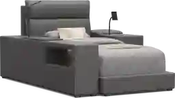 Your forecast calls for a 100% chance of style and super smart bedroom design when you bring the Cloud9 collection home. Perfect for older kids, teens and young adults, this set features a sleek silhouette with softly padded panels wrapped in plush suede-soft charcoal colored upholstery. The twin bed's headboard is generously cushioned for lounging and finished with subtle stitch lines that add dimension without overwhelming the piece, while the low platform base grounds the bed with clean, modern lines. The bookcase includes a swivel table, dual USB charging ports, glow-in-the-dark cup holder and a touch LED reading light, plus open compartments for books and decor. The nightstand adds even more function with a wireless charging phone holder, USB ports, hidden storage under a lift-top panel and an open cubby for grab-and-go essentials. Upholstery: 100% Polyester. Mattress and foundation (if required) sold separately.
