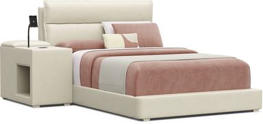 Your forecast calls for a 100% chance of style and super smart bedroom design when you bring the Cloud9 collection home. Perfect for older kids, teens and young adults, this set features a sleek silhouette with softly padded panels wrapped in soft-touch cream upholstery. The bed's generously cushioned headboard is finished with subtle stitch lines that add dimension, while the low platform base grounds the full bed with clean, modern lines. The matching lounger offers a relaxed, low-slung seat that's perfect for reading, gaming or hanging out. The bookcase includes a swivel table, touch LED light, USB charging ports and glow-in-the-dark cup holder, plus open cubbies for books and display. The nightstand adds even more convenience with an adjustable phone holder with wireless charging, dual USB ports, and a lift-top panel with hidden storage. A side cubby keeps journals and grab-and-go essentials within reach. Upholstery: 70% Polyvinyl Chloride, 27% Terylene, 3% Polyurethane. Mattress and foundation (if required) sold separately.