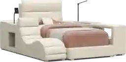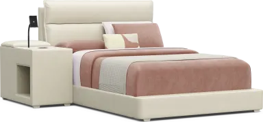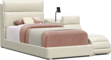 Your forecast calls for a 100% chance of style and super smart bedroom design when you bring the Cloud9 collection home. Perfect for older kids, teens and young adults, this set features a sleek silhouette with softly padded panels wrapped in soft-touch cream upholstery. The bed's generously cushioned headboard is finished with subtle stitch lines that add dimension, while the low platform base grounds the twin bed with clean, modern lines. The matching lounger offers a relaxed, low-slung seat that's perfect for reading, gaming or hanging out. The bookcase includes a swivel table, touch LED light, USB charging ports and glow-in-the-dark cup holder, plus open cubbies for books and display. The nightstand adds even more convenience with an adjustable phone holder with wireless charging, dual USB ports, and a lift-top panel with hidden storage. A side cubby keeps journals and grab-and-go essentials within reach. Upholstery: 70% Polyvinyl Chloride, 27% Terylene, 3% Polyurethane. Mattress and foundation (if required) sold separately.