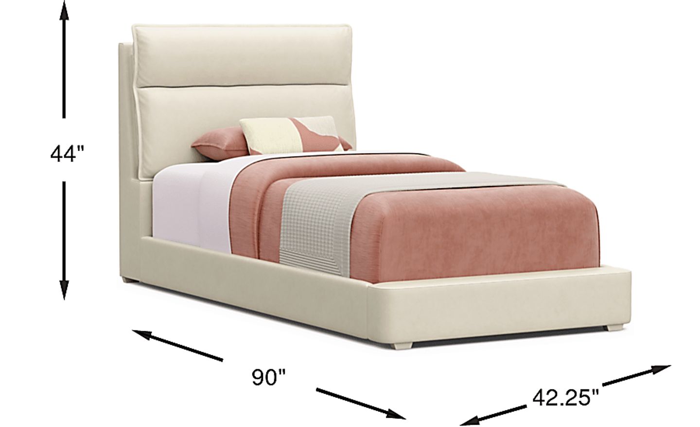 Your forecast calls for a 100% chance of style and unbelievable cool factor when you bring the Cloud9 collection home. Perfect for older kids, teens and young adults, this bed features a sleek silhouette with softly padded panels that give off a tailored yet laid-back vibe. The headboard is generously cushioned for lounging and finished with subtle stitch lines that add dimension without overwhelming the piece. The low platform base grounds the twin bed with clean, modern lines, while the soft-touch cream-tone upholstery offers a grown-up look and feel. Upholstery: 70% Polyvinyl Chloride, 27% Terylene, 3% Polyurethane. Mattress and foundation (if required) sold separately.