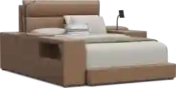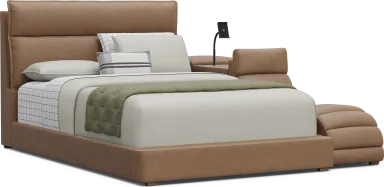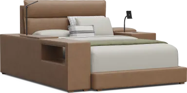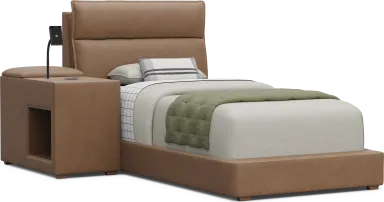 Your forecast calls for a 100% chance of style and super smart bedroom design when you bring the Cloud9 collection home. Perfect for older kids, teens and young adults, this set features a sleek silhouette with softly padded panels wrapped in plush suede-soft saddle colored upholstery. The full bed's headboard is generously cushioned for lounging and finished with subtle stitch lines that add dimension without overwhelming the piece, while the low platform base grounds the bed with clean, modern lines. The bookcase includes a swivel table, dual USB charging ports, glow-in-the-dark cup holder and a touch LED reading light, plus open compartments for books and decor. The nightstand adds even more function with a wireless charging phone holder, USB ports, hidden storage under a lift-top panel and an open cubby for grab-and-go essentials. Upholstery: 100% Polyester. Mattress and foundation (if required) sold separately.
