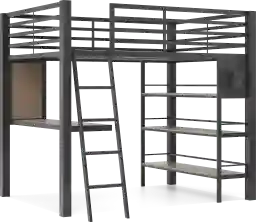 Designed to save space and explore creativity, the Colefax Avenue loft bed features clean lines and a sleek contemporary design. Constructed with a metal frame with a melamine finish in a rich dark gray color, the full-sized bed is flanked with side rails and a sturdy ladder. A built-in desk and corkboard make it easy to complete homework assignments or art projects, while three wooden shelves are great for displaying favorite books, trophies, or other beloved items. Mattress and foundation (if required) sold separately.