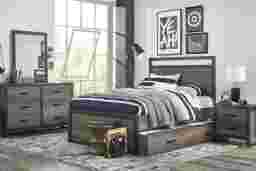 Drawing from timeless style and inspired by modern design, the Colefax Avenue bed combines distinctive lines with a two-tone light and dray gray finish. Constructed from melamine and wood solids, the headboard features a horizontal cutout to create eye appeal. The perfect balance of contemporary style and versatility makes it the perfect place for your teen to get a great night's sleep. Mattress and foundation (if required) sold separately.