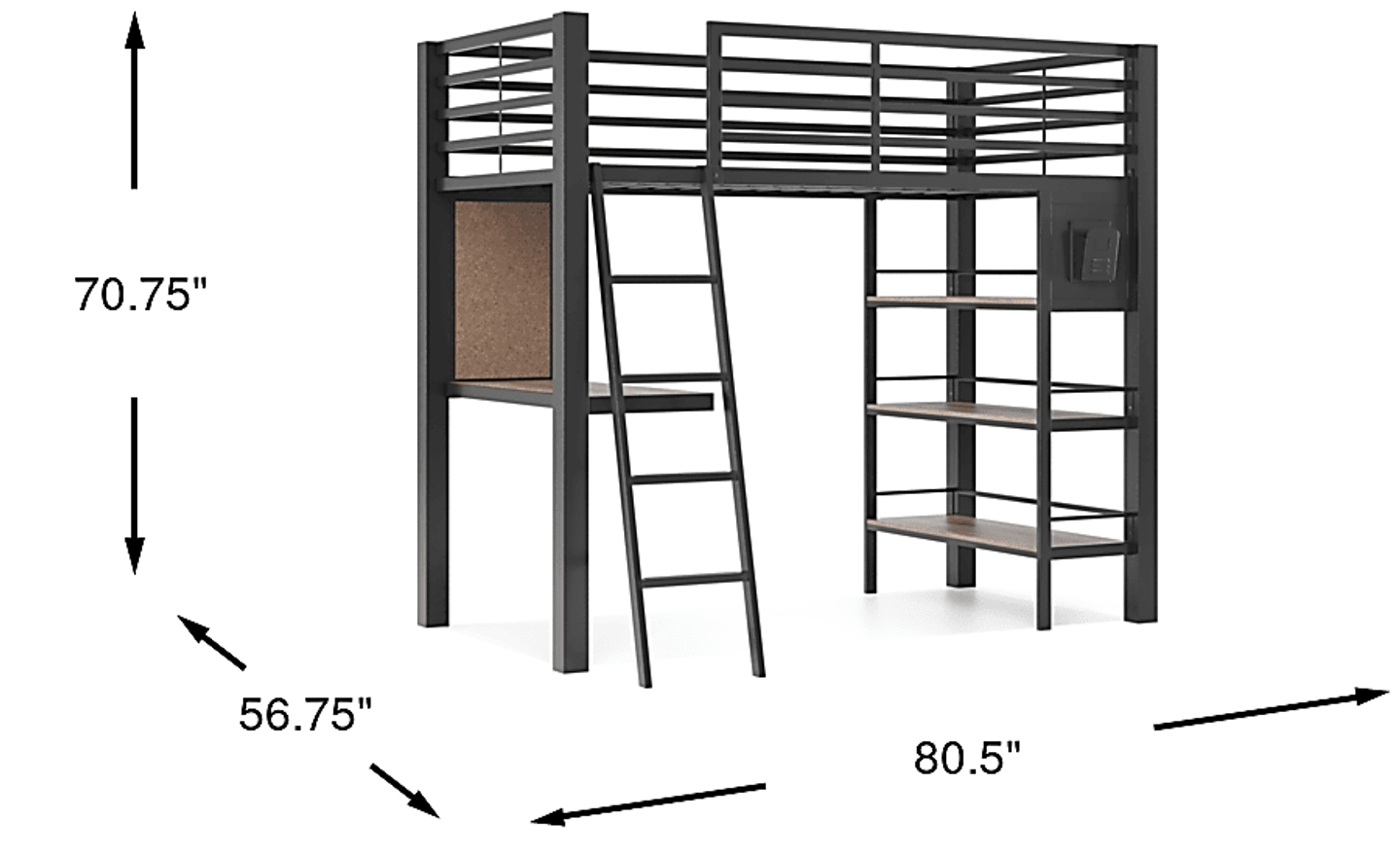 Designed to save space and explore creativity, the Colefax Avenue loft bed features clean lines and a sleek contemporary design. Constructed with a metal frame with a melamine finish in a chic dark gray color, the twin-sized bed is flanked with side rails and a sturdy ladder. A built-in desk and corkboard make it easy to complete homework assignments or art projects, while three wooden shelves are great for displaying favorite books, trophies, or other beloved items. Mattress and foundation (if required) sold separately.