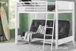 Blending an industrial inspired design with a sleek modern look, the Colefax Avenue bunk bed offers a space saving style for your loved one's space. Constructed with a metal frame with a melamine finish in a chic white color, the full-sized bed on top is flanked with sleek side rails. A sturdy ladder leads down to the futon great place for friends to chill or a resting place for overnight guests. Mattress and foundation (if required) sold separately. Futon mattress not included.