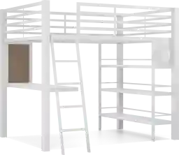 Designed to save space and explore creativity, the Colefax Avenue loft bed features clean lines and a sleek contemporary design. Constructed with a metal frame with a melamine finish in a chic white color, the full-sized bed is flanked with side rails and a sturdy ladder. A built-in desk and corkboard make it easy to complete homework assignments or art projects, while three wooden shelves are great for displaying favorite books, trophies, or other beloved items. Mattress and foundation (if required) sold separately. Bed shown is twin size.