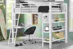 Designed to save space and explore creativity, the Colefax Avenue loft bed features clean lines and a sleek contemporary design. Constructed with a metal frame with a melamine finish in a chic white color, the twin-sized bed is flanked with side rails and a sturdy ladder. A built-in desk and corkboard make it easy to complete homework assignments or art projects, while three wooden shelves are great for displaying favorite books, trophies, or other beloved items. Mattress and foundation (if required) sold separately.