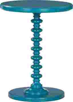 The Corby teal table features a bright, smooth finish and a spindle circular base. Its round edges and classic style will add charm to any space. Sized perfectly to sit next to your favorite chair, the table gives a fun pop of color to any room. Customer assembly is required.