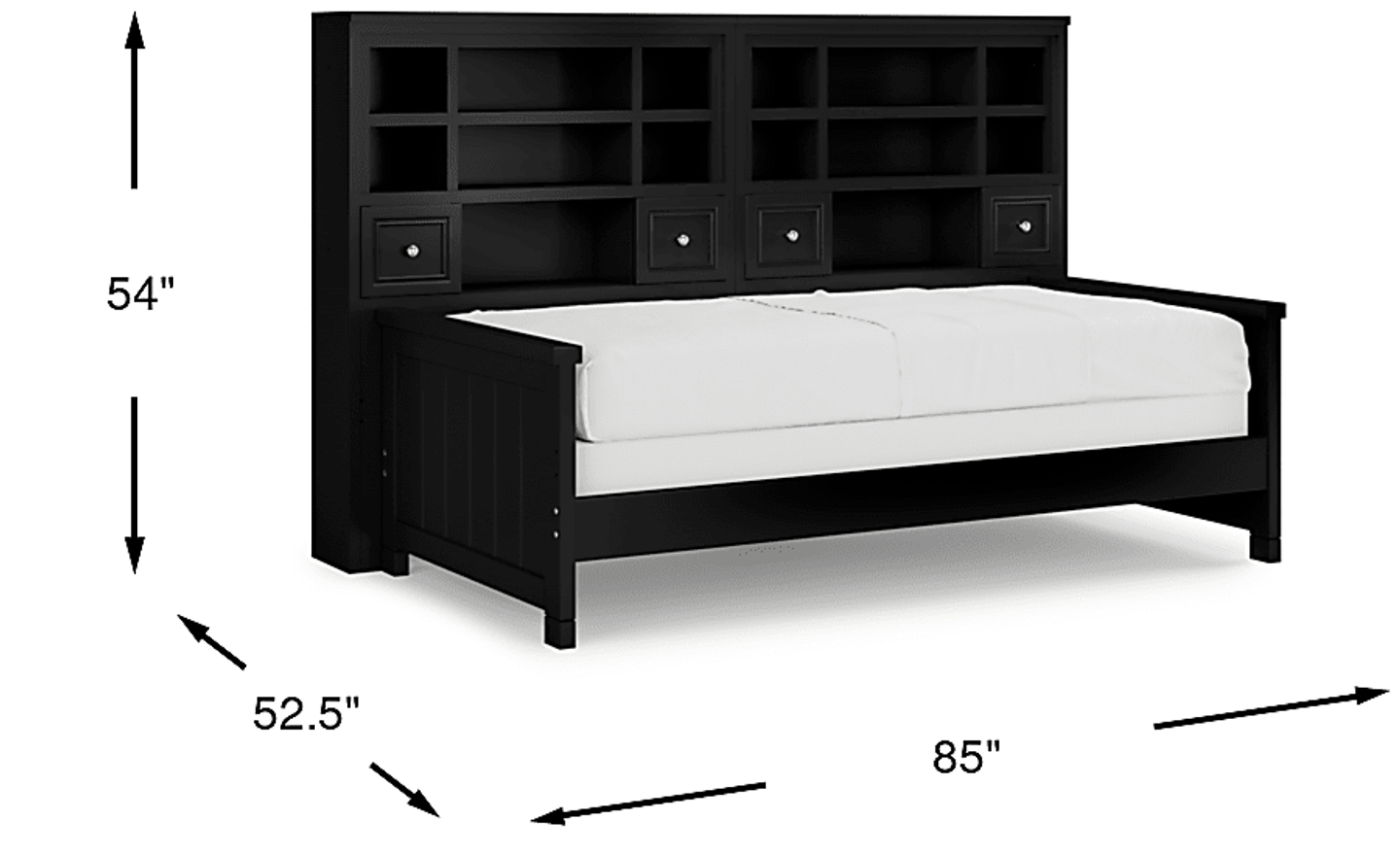 Make the most of the space in your child's bedroom with the Cottage Colors bookcase daybed. Featuring double bookshelves with open cubbies and drawers, there is plenty of space to store books or display collectibles. Showcasing a chic black finish, the bed is detailed with beautiful paneling details for a timeless look. A dual height rail setting offers an adjustable height, growing with your child. Store an extra mattress in style with the matching trundle option, sold separately. Mattress and foundation (if required) sold separately.