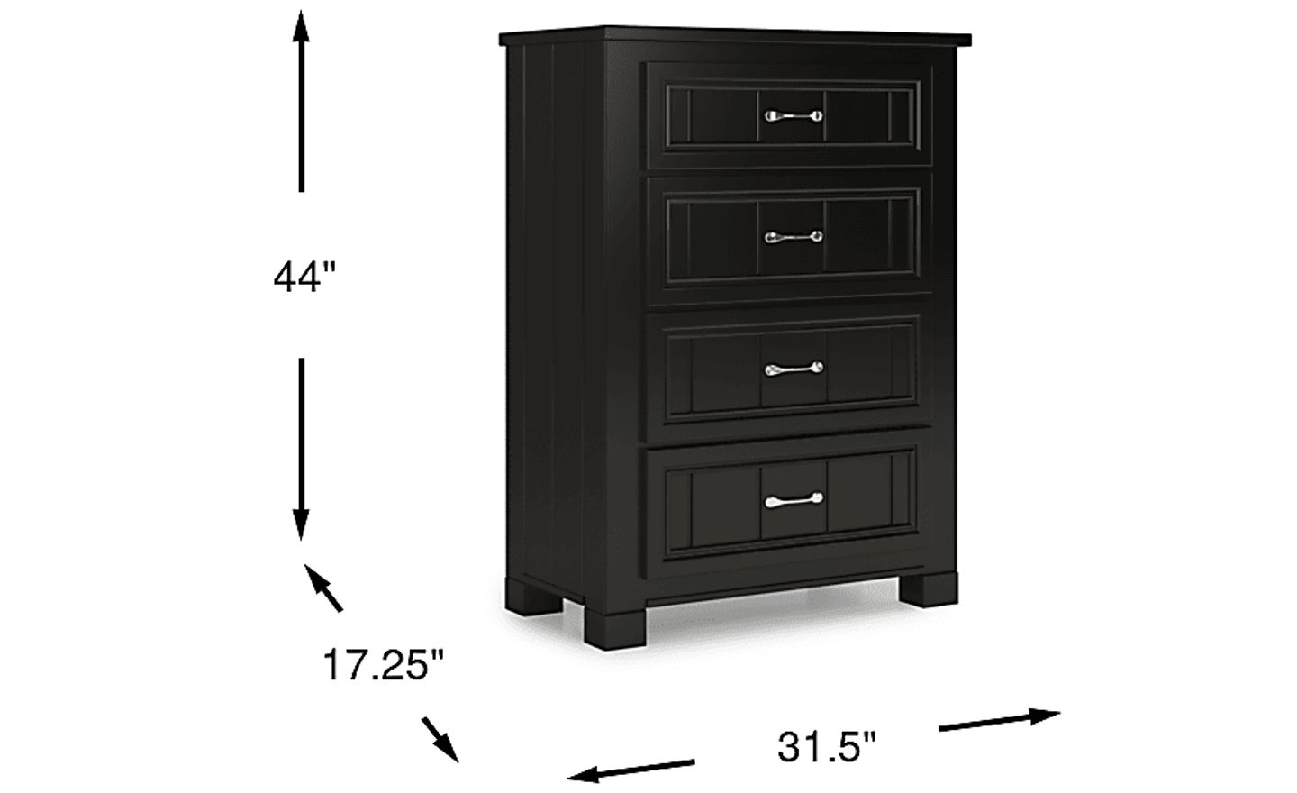 Perfect for any type of folded clothing, the Cottage Colors chest will be a welcome addition to your child's room. The piece showcases a fantastic black finish, making it versatile and attractive. Four drawers are spacious enough from anything from delicate clothes to bulky sweaters. And thanks to its rounded edges and anti-tipping certification, this chest has added safety.