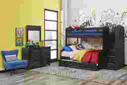 The Cottage Colors collection offers a great look and fantastic value. The bunk features convenient and safe steps for easy access to the top bunk. Drawers built into the steps ensure that that no space is wasted so your child has convenient storage. The chic black finish, pretty paneling detail and brushed nickel finished hardware add to the charm and ensure the room will remain appealing as your child grows. The bed below can accommodate an optional trundle storage drawer sold separately. Mattress and foundation (if required) sold separately. Bottom bed is full size; not as shown. Trundle sold separately. Bunkie boards required.