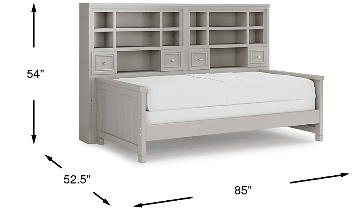 Make the most of the space in your child's bedroom with the Cottage Colors bookcase daybed. Featuring double bookshelves with open cubbies and drawers, there is plenty of space to store books or display collectibles. Showcasing a fantastic gray finish, the bed is detailed with beautiful paneling. Store an extra mattress in style with the matching trundle option, sold separately. Mattress and foundation (if required) sold separately.