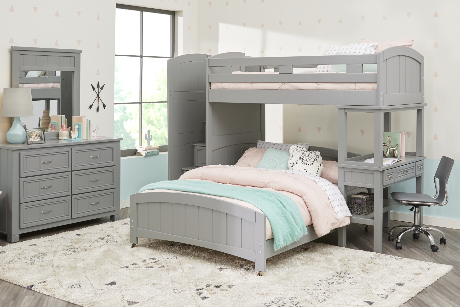 The Cottage Colors twin/full step bunk offers a great look and fantastic value. The bunk features convenient and safe steps for easy access to the top bunk at one end and a built in desk at the other. Drawers built into the steps ensure that that no space is wasted so your child has convenient storage. The chic gray finish, pretty paneling detail and brushed nickel finished hardware add to the charm and ensure the room will remain appealing as your child grows. The bed below can accommodate an optional trundle storage drawer sold separately. Mattresses and foundations (if required) sold separately. Bunkie Boards required for mattress support.