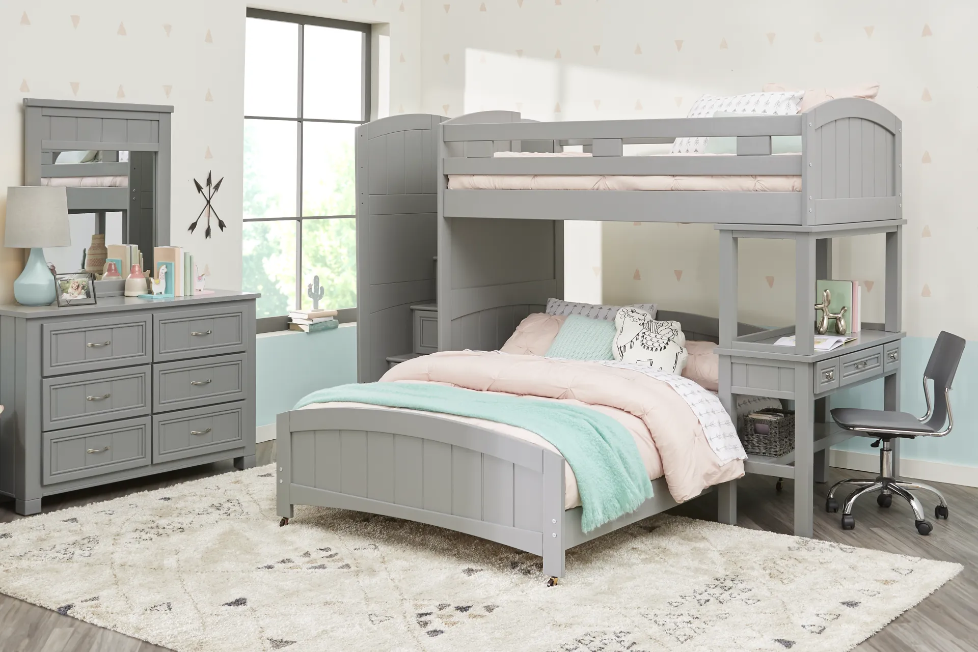 The Cottage Colors twin/full step loft offers a great look and fantastic value. The loft features convenient and safe steps for easy access to the top bunk at one end and a built in desk at the other. Drawers built into the steps ensure that that no space is wasted so your child has convenient storage. The chic gray finish, pretty paneling detail and brushed nickel finished hardware add to the charm and ensure the room will remain appealing as your child grows. Mattresses and foundations (if required) sold separately. Bunkie Boards required for mattress support.