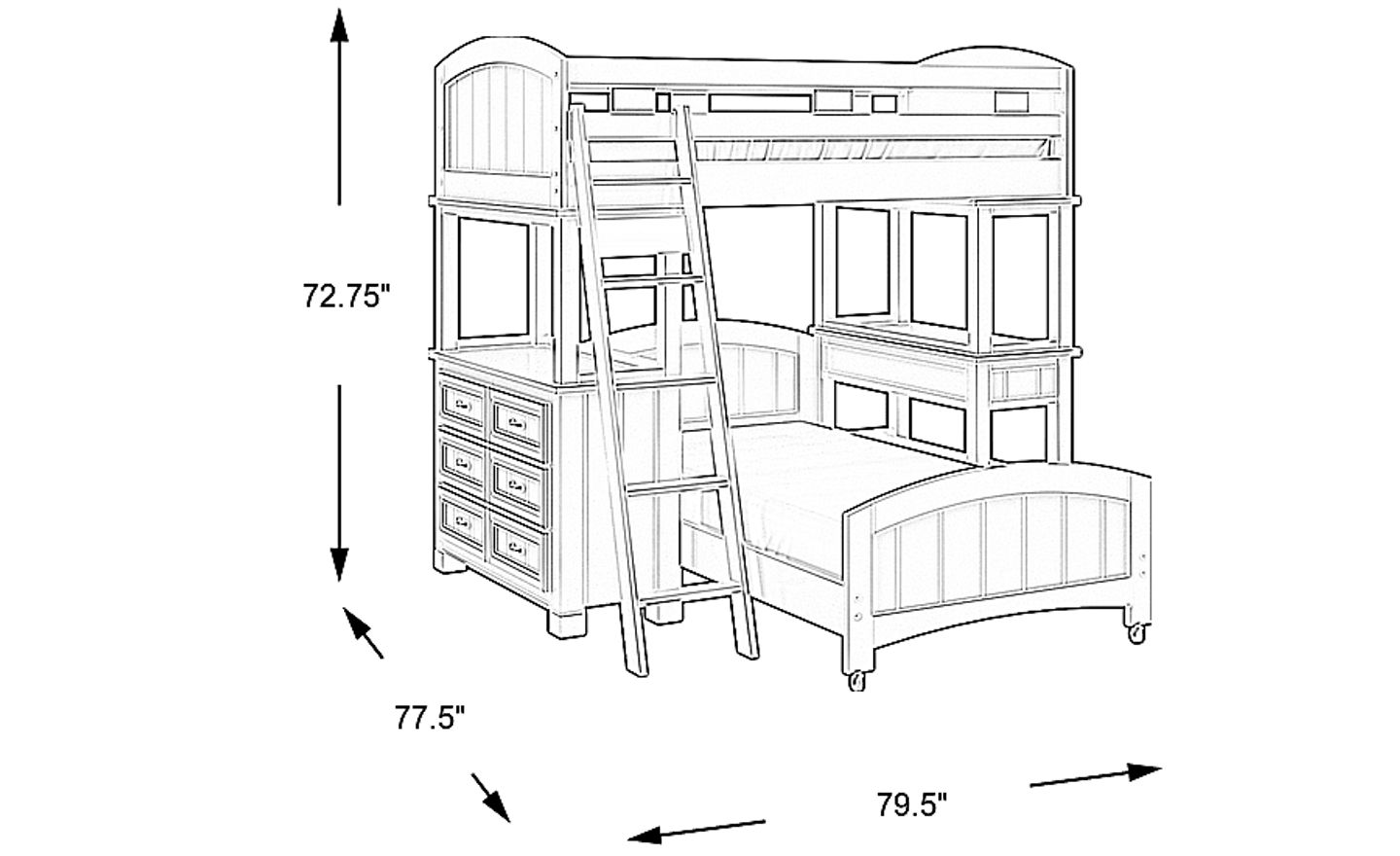 The Cottage Colors twin/twin loft bunk offers a great look and fantastic value. This classic bunk keeps it simple with a traditional design that will never go out of style while a built in desk and dresser ensure no space is wasted. The chic gray finish, pretty paneling detail and brushed nickel finished hardware add to the charm and ensure the room will remain appealing as your child grows. Mattresses and foundations (if required) sold separately. Bunkie Boards required for mattress support.