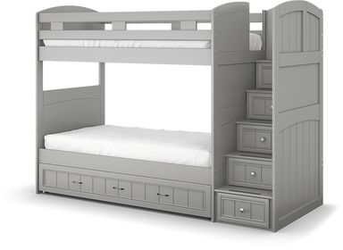 The Cottage Colors collection offers a great look and fantastic value. The bunk features convenient and safe steps for easy access to the top bunk. Drawers built into the steps ensure that that no space is wasted so your child has convenient storage. The chic gray finish, pretty paneling detail and brushed nickel finished hardware add to the charm and ensure the room will remain appealing as your child grows. The bed below can accommodate an optional trundle storage drawer sold separately. Mattress and foundation (if required) sold separately. Trundle sold separately. Bunkie boards required.