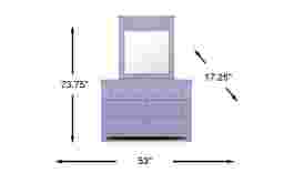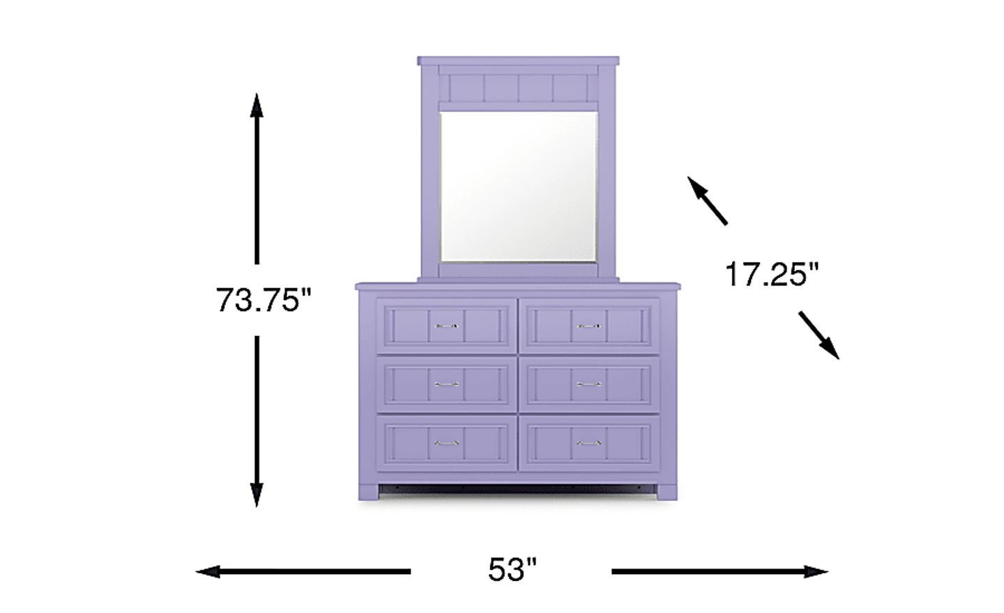 An attractive bedroom essential, the Cottage Colors dresser & mirror set provides an excellent place to prepare for the day ahead. Crafted of poplar solids with a pretty lavender finish, each of the six drawers features paneling details and brushed nickel finished hardware with kenlin drawer guides for durability. Drawer pulls are rounded, and thanks to anti-tipping certification and curved edges, the dresser has added safety. The matching mirror is designed to affix to the dresser.