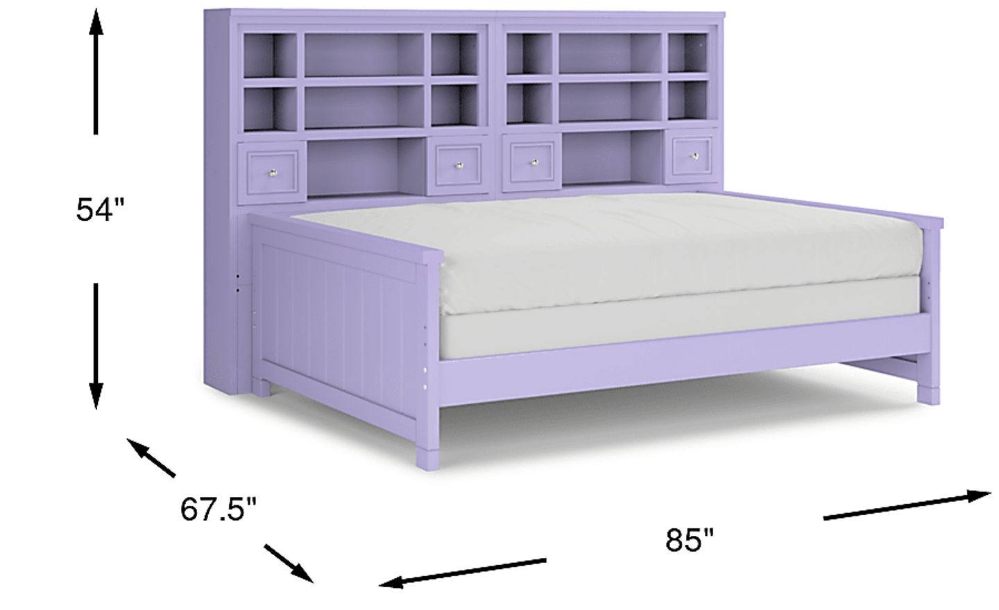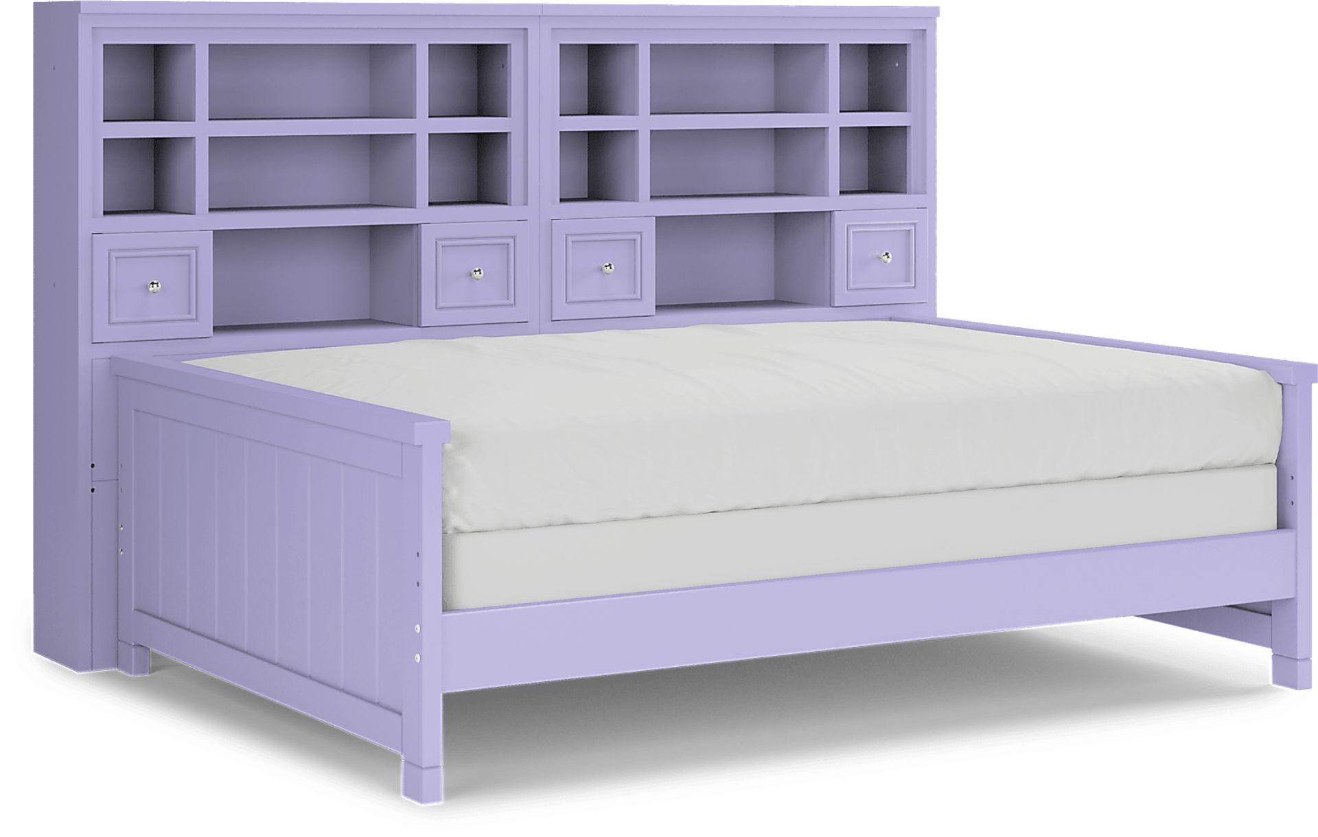 Make the most of the space in your child's bedroom with the Cottage Colors bookcase daybed. Featuring double bookshelves with open cubbies and drawers, there is plenty of space to store books or display collectibles. Crafted of durable poplar solids with a pretty lavender finish, the bed is detailed with beautiful paneling details for a timeless look. A dual height rail setting offers an adjustable height, growing with your child. Store an extra mattress in style with the matching trundle option, sold separately. Mattress and foundation (if required) sold separately. Bed shown is twin size.