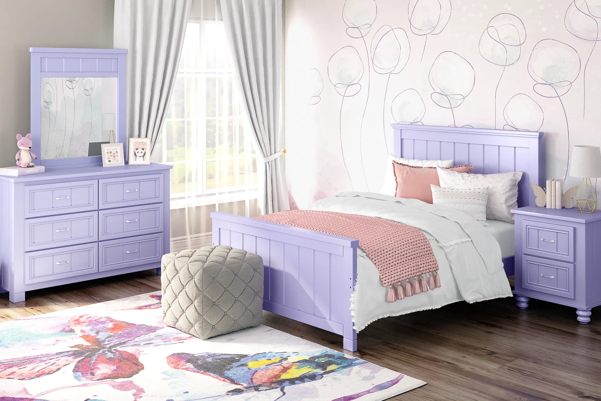 Underbed storage trundle not included. Offering a fresh look and terrific value, the Cottage Colors collection features a classic style that will remain appealing as your child grows. The panel bed is a timeless choice while the delightful fresh purple finish makes it a fun and colorful addition to your child's room. Pretty paneling detail and brushed nickel finished hardware add to the appeal. Mattress and foundation (if required) sold separately.