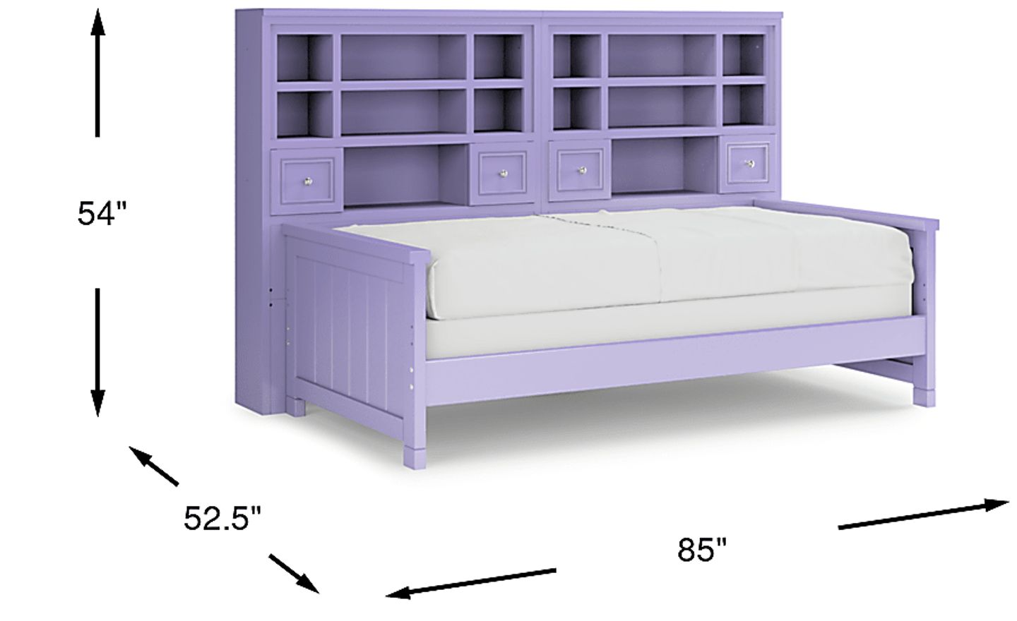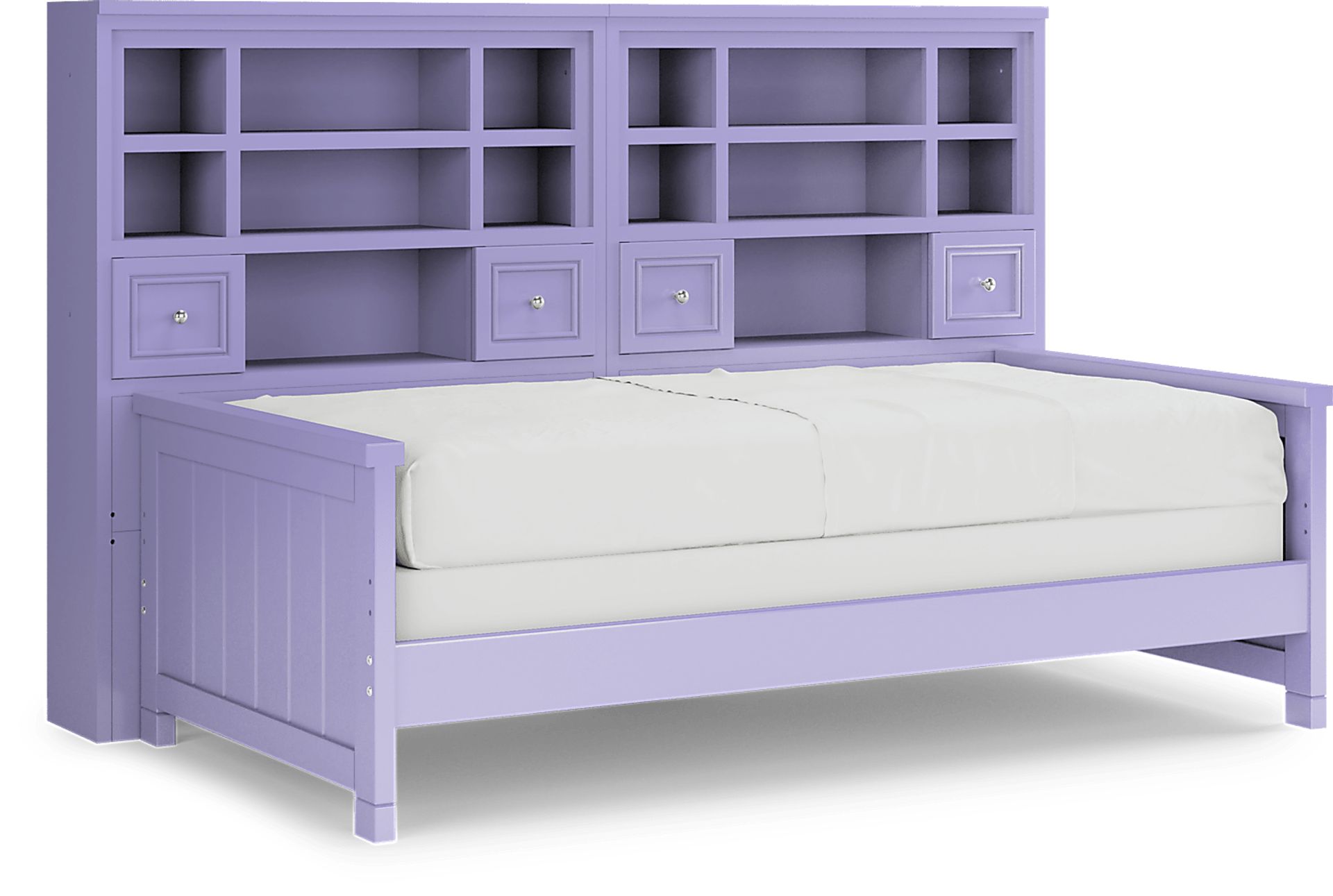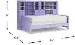 Make the most of the space in your child's bedroom with the Cottage Colors bookcase daybed. Featuring double bookshelves with open cubbies and drawers, there is plenty of space to store books or display collectibles. Crafted of durable poplar solids with a pretty lavender finish, the bed is detailed with beautiful paneling details for a timeless look. A dual height rail setting offers an adjustable height, growing with your child. Store an extra mattress in style with the matching trundle option, sold separately. Mattress and foundation (if required) sold separately.