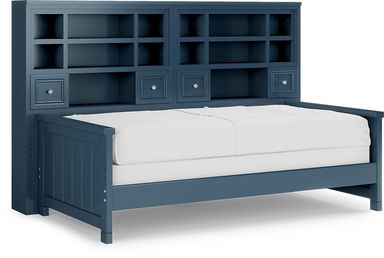 Make the most of the space in your child's bedroom with the Cottage Colors bookcase bed. The headboard features handy space for books or displaying collectibles, offering them a creative hand in their own decoration. Showcasing a bold blue finish, the bed is detailed with beautiful paneling details for a timeless look. A dual height rail setting offers an adjustable height, growing with your child. Store an extra mattress in style with the matching trundle option, sold separately. Mattress and foundation (if required) sold separately.