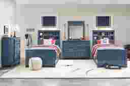 The Cottage Colors collection offers a great look and fantastic value. For storage, each of the headboards offer a handy shelf for books or collectibles. The bold blue finish makes it easy and fun to add a colorful nightstand or chest (available, but sold separately) in cool accent colors. Pretty paneling details and brushed nickel finished hardware add to the charm and ensure the room will remain appealing throughout the years. The bed features a dual height rail system that grows with your child. Mattresses and foundations (if required) sold separately.