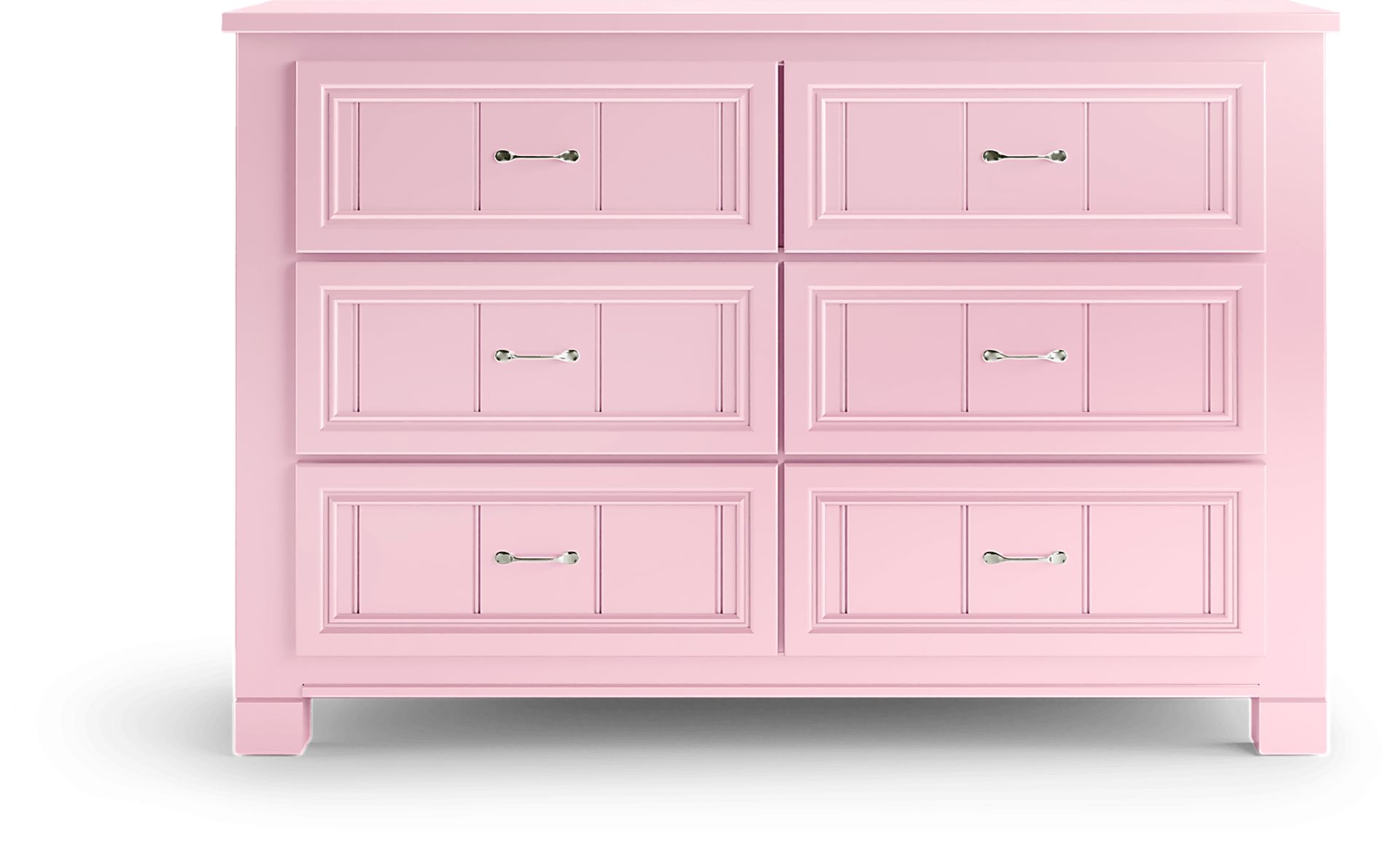 An attractive bedroom essential, the Cottage Colors dresser provides six generous drawers of storage. The piece is crafted of poplar solids with a charming pink finish. Each drawer has paneling detail and brushed nickel finished hardware. Drawer pulls are rounded and edges are curved for added safety.