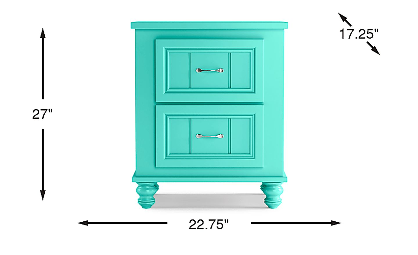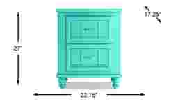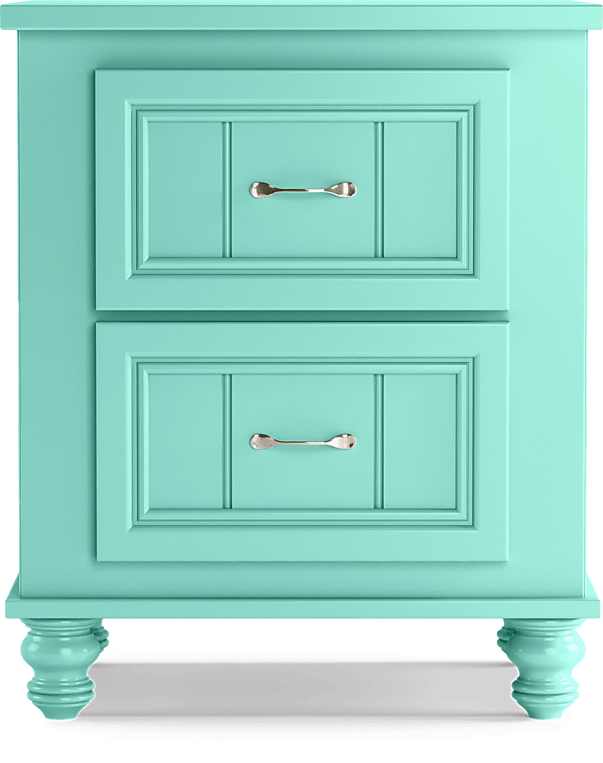 The Cottage Colors nightstand is ideal for keeping a lamp, clock and other bedside necessities close by. Made of poplar solids with an enchanting turquoise finish, its two roomy drawers feature beautiful paneling and brushed nickel finished hardware.