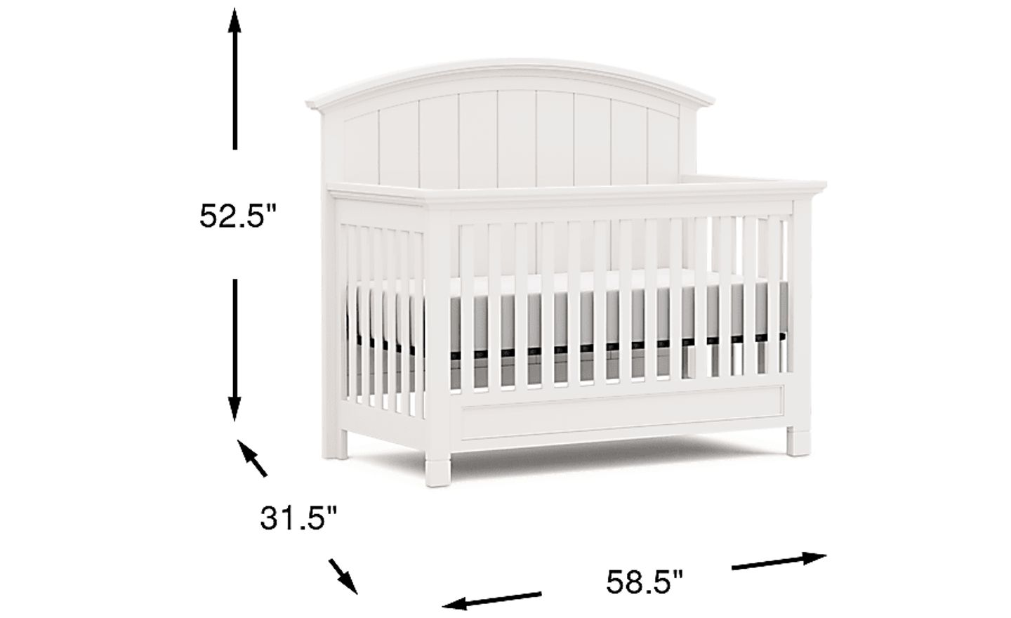 The clean, white finish and classic arched headboard make this an excellent centerpiece for coastal, traditional, or transitional nurseries. With dimensions of approximately 58.5"w x 31.5"d, it fits comfortably within standard nursery layouts. Its bright finish is particularly effective in smaller rooms or urban nurseries, as white furniture helps to visually expand a space and maximize natural light, creating an airy and tranquil environment.