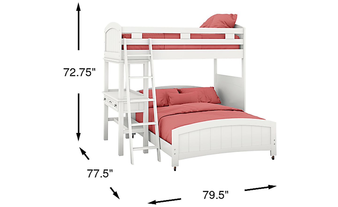 This configuration is an exceptional space-saving solution for smaller urban apartments or compact suburban bedrooms. By utilizing vertical space, it provides both a twin and a full-sized sleeping area within a 79.5" x 77.5" footprint. The built-in desk further maximizes the room's utility, eliminating the need for a separate study desk and leaving more floor space for play or additional storage.