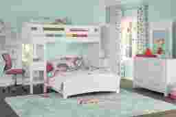 The Cottage Colors twin/full step bunk offers a great look and fantastic value. The bunk features convenient and safe steps for easy access to the top bunk at one end and a built in desk at the other. Drawers built into the steps ensure that that no space is wasted so your child has convenient storage. The chic white finish, pretty paneling detail and brushed nickel finished hardware add to the charm and ensure the room will remain appealing as your child grows. The bed below can accommodate an optional trundle storage drawer sold separately. Mattresses and foundations (if required) sold separately. Bunkie Boards required for mattress support.