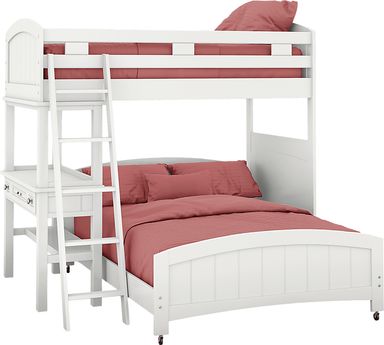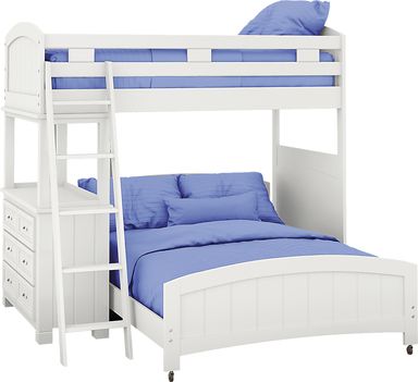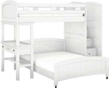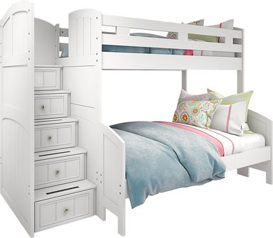 The Cottage Colors twin/full step loft offers a great look and fantastic value. The loft features convenient and safe steps for easy access to the top bunk at one end and a built in dresser at the other. Drawers built into the steps ensure that that no space is wasted so your child has convenient storage. The chic white finish, pretty paneling detail and brushed nickel finished hardware add to the charm and ensure the room will remain appealing as your child grows. Mattresses and foundations (if required) sold separately. Bunkie Boards required for mattress support.