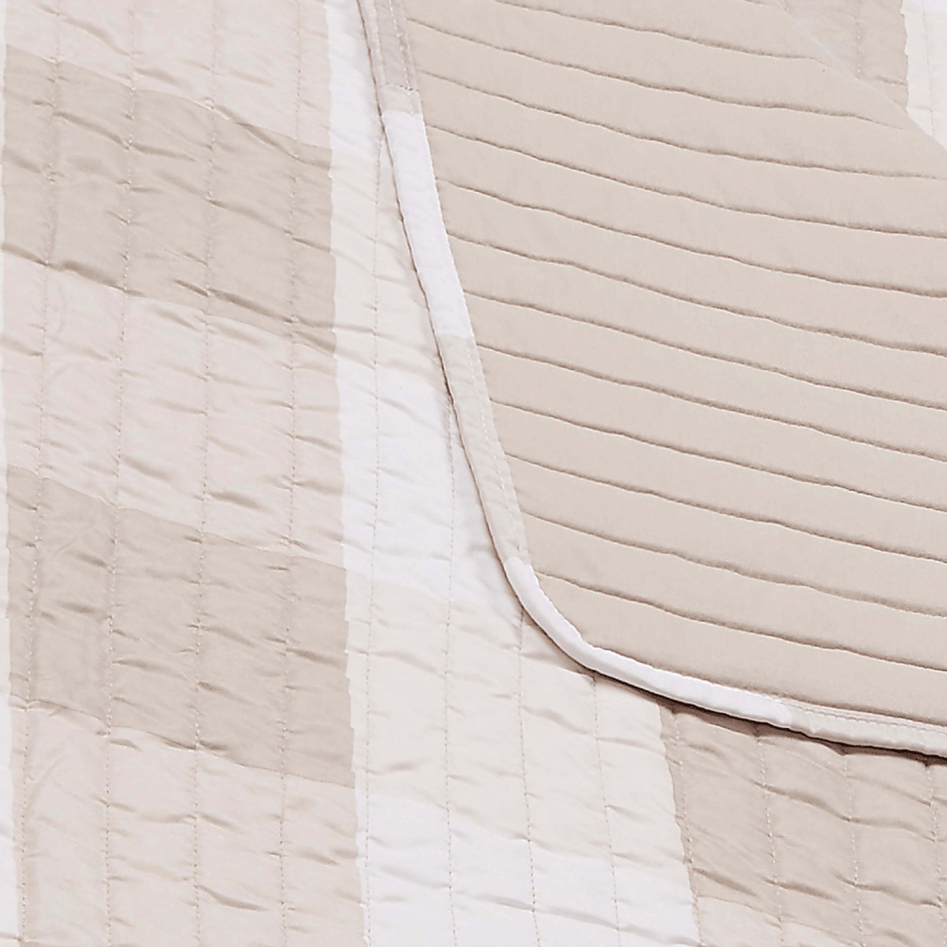 The large buffalo check print Cottage Pearl set features a white background and khaki intersecting pattern on the face of the quilt and shams. The twin comforter set includes: one twin XL quilt 68x90 inches and one standard sham 20x26 inches. Quilt and sham face and back are made of 100% microfiber polyester fabric with cotton rich filling. These items are all machine washable; however, care should be taken to use appropriate sized equipment.