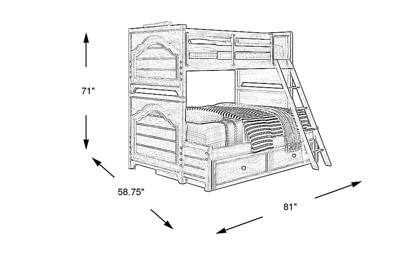 Nestle your child in the serenity of the Country Hollow twin/full bunk bed. Crafted of pine solids and veneers in precious brown fawn finish, this twin over full bunk features embossed moulding style details that add quaint touches of cottage whimsy to any bedroom. A ladder provides easy access between top and bottom bunk with five careful steps. Trundle not included. Mattresses and foundations (if required) sold separately. This product requires a bunkie board (sold separately).