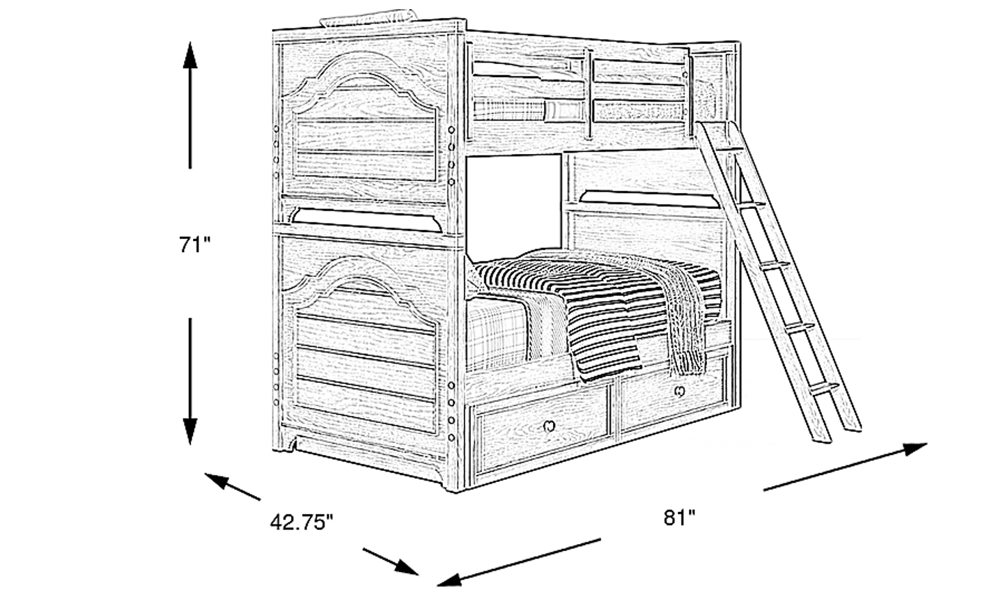 Nestle your child in the serenity of the Country Hollow twin/twin bunk bed. Crafted of pine solids and veneers in precious brown fawn finish, this twin over twin bunk features embossed moulding style details that add quaint touches of cottage whimsy to any bedroom. A ladder provides easy access between top and bottom bunk with five careful steps. Trundle not included. Mattresses and foundations (if required) sold separately. This product requires a bunkie board (sold separately)