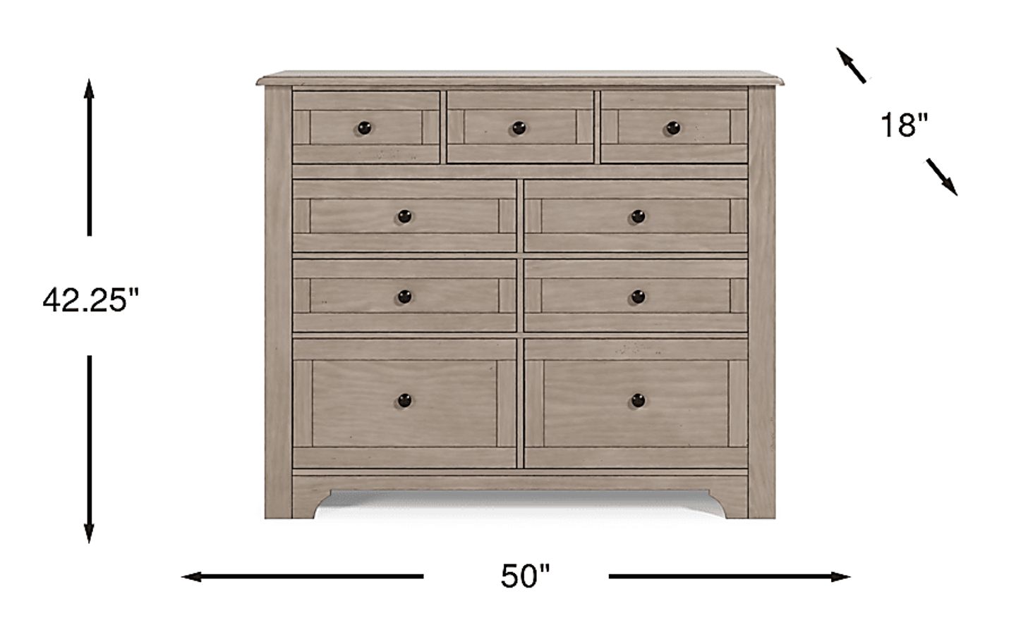 Add a quaint touch of cottage whimsy to any bedroom with the Country Hollow bureau. Crafted with pine solids and hardwoods in a precious brown fawn finish, this nine-drawer bureau features reinforced corner blocks for strength and stability. The drawers, configured with French dovetail fronts and English dovetail backs with ball bearing side glides, are varied in size and provide storage for clothing, personal items, and more. Each drawer front is framed with dark cast knob pulls in the center for the perfect final style details.