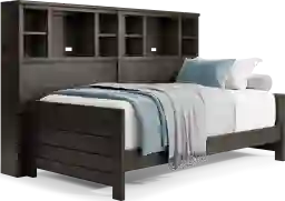 With a timeless look and classic construction, the Creekside 2.0 bookcase wall bed is a wonderful choice for saving space in your child's room. Crafted with pine veneers in a charcoal finish, this twin bed features a bookcase headboard with shelves that have integrated wire management to help keep your child's favorite things within arm's reach. Mattress and foundation (if required) sold separately.
