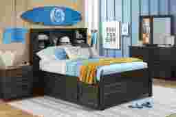 With its timeless look, the Creekside 2.0 bedroom is an excellent choice for your child's space. Crafted of pine solids and veneers in a charcoal finish, this full-size bed features a bookcase headboard with shelves that have integrated wire management to help keep your child's favorite things within arm's reach. Two storage side rails, each with two doors and a pair of drawers, provide bedside space for your loved one to store comics, books and more of their favorite things. The coordinating dresser features metal strap drawer pulls for a hint of industrial-inspired flair and is configured with English dovetail fronts and bottom mounted metal drawer glides. The attachable mirror features corkboard space that your child will have a blast decorating. Mattress and foundation sold separately. This product requires a bunkie board (sold separately).