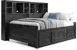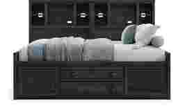 With a timeless look and classic construction, the Creekside 2.0 bookcase wall bed is a wonderful choice for saving space in your child's room. Crafted with pine veneers in a charcoal finish, this full-size wall bed features a bookcase headboard with shelves that have integrated wire management to help keep your child's favorite things within arm's reach. Additionally, a storage side rail with two doors and a pair of drawers provides bedside space to store comics, books and more. Mattress and foundation (if required) sold separately.