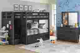 Get a space saving solution without sparing on timeless style appeal when you choose the Creekside 2.0 bunk bed for your child's room. Crafted of pine solids and veneers in a charcoal finish, this full/full step bunk bed features a ladder built into the side of the frame while the other end is configured with five easy-peasy steps to take instead. Additionally, four of the steps have drawers to help store away your child's favorite things, while a storage side rail provides even more bedside storage with two doors and a pair of drawers. Mattresses and foundations sold separately. This product requires a bunkie board (sold separately)