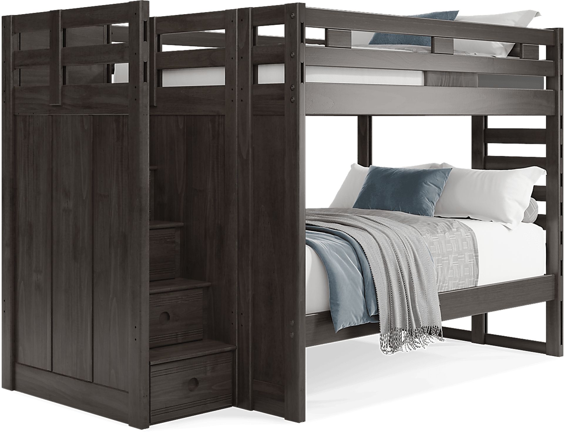 Get a space saving solution without sparing on timeless style appeal when you choose the Creekside 2.0 bunk bed for your child's room. Crafted with pine veneers in a charcoal finish, this full/full step bunk bed features a ladder built into the side of the frame while the other side is configured with five easy-peasy steps to take instead. Additionally, four of the steps have drawers to help store away your child's favorite things. This bed requires a foundation for proper use. Mattress and foundation sold separately.