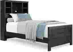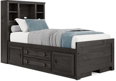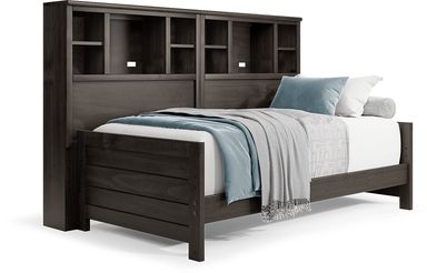 With a timeless look and classic construction, the Creekside 2.0 bookcase bed is a wonderful choice for saving space in your child's room. Crafted with pine veneers in a charcoal finish, this twin-size bed features a bookcase headboard with shelves that have integrated wire management to help keep your child's favorite things within arm's reach. Mattress and foundation (if required) sold separately.