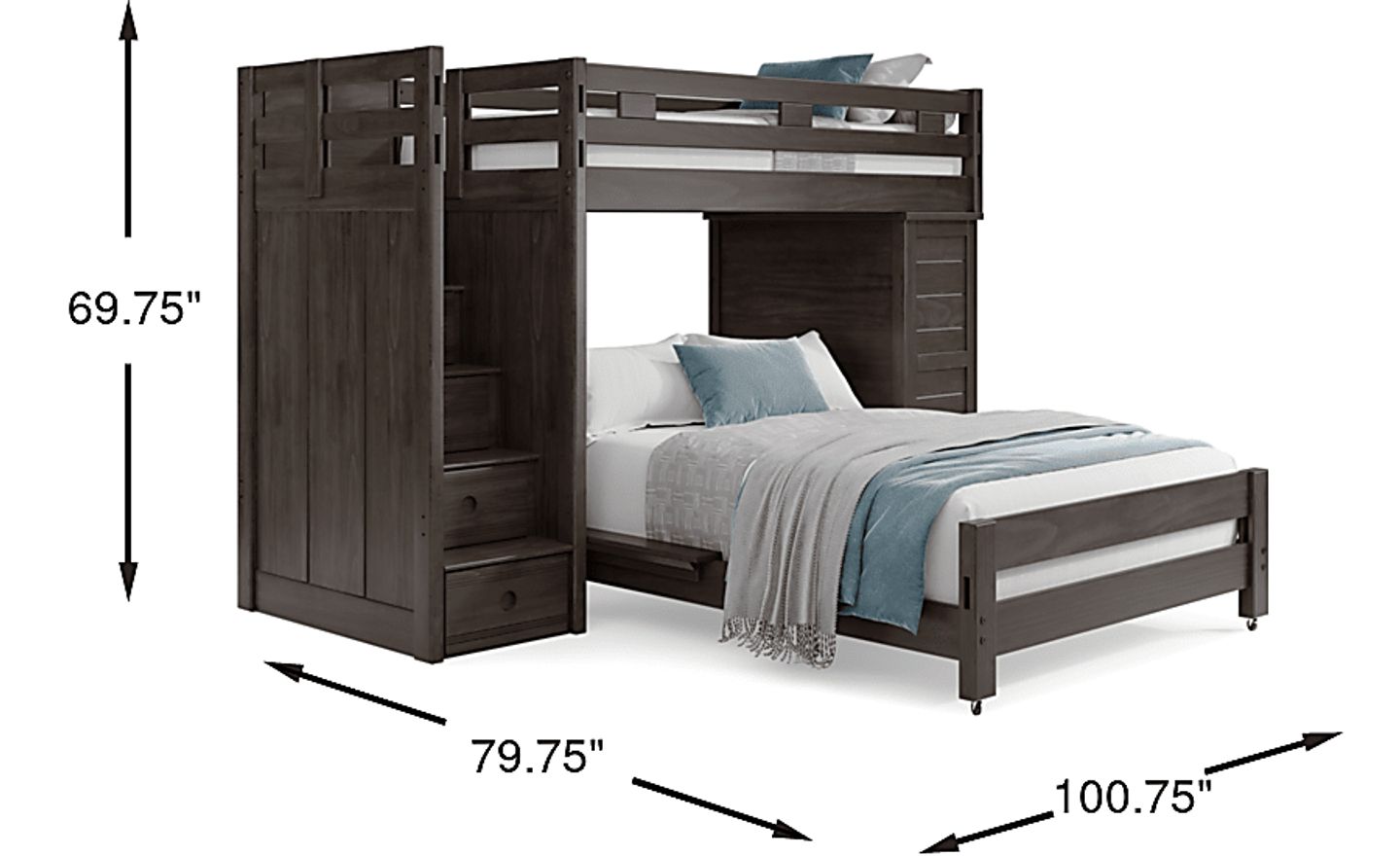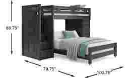 Get a space saving solution without sparing on timeless style appeal when you choose the Creekside 2.0 loft bed for your child's room. Crafted with pine veneers in charcoal finish, this twin bed sits atop a loft that features a storage loft chest on one side of the frame with five steps configured onto the opposite end for easy-peasy ups and downs to and from bed. Additionally, four of the steps have drawers to help store away some of your child's favorite things. Just beneath the bed, a full-size caster bed offers an additional place for sleep. Mattresses and foundations sold separately. This product requires a bunkie board (sold separately).
