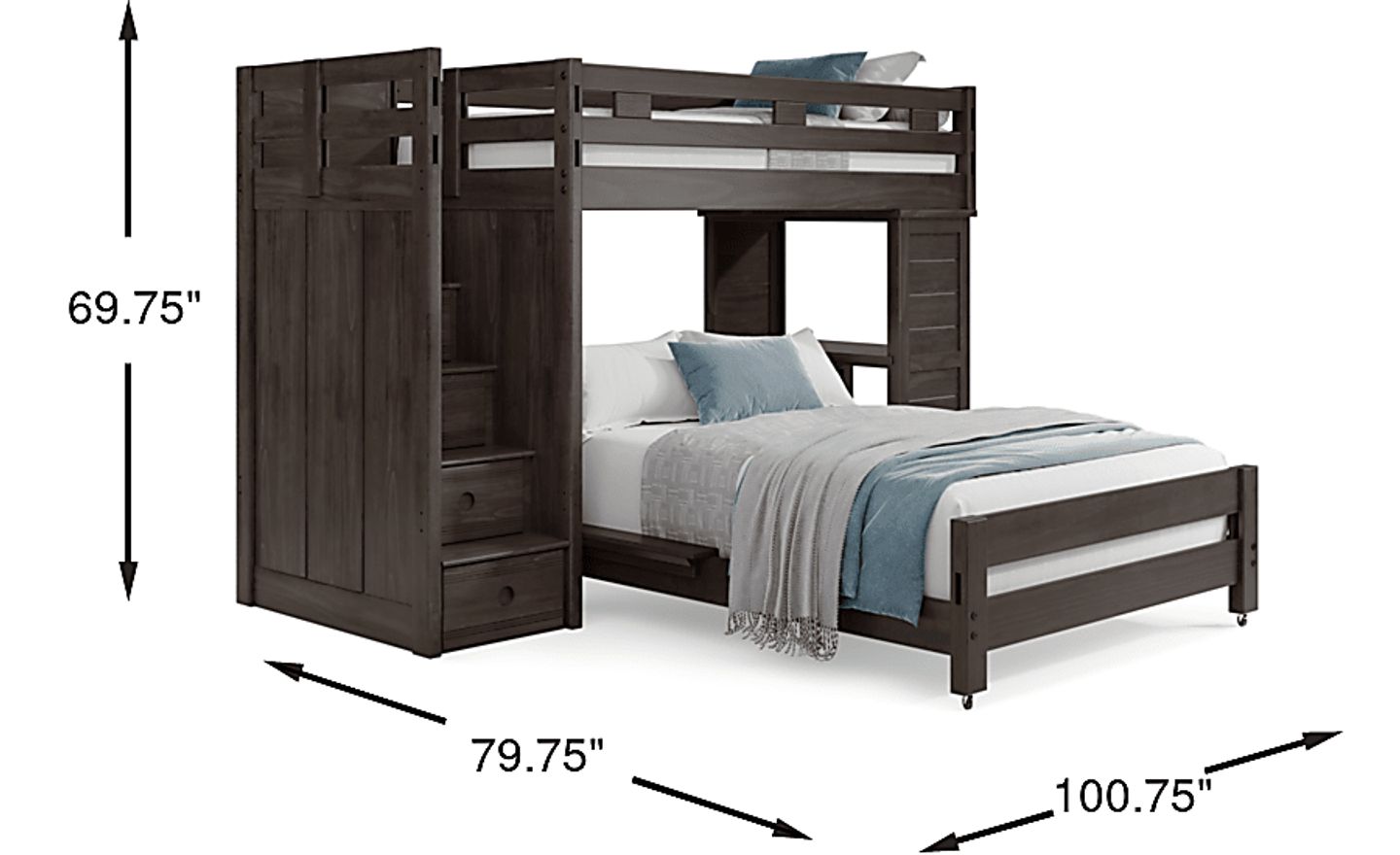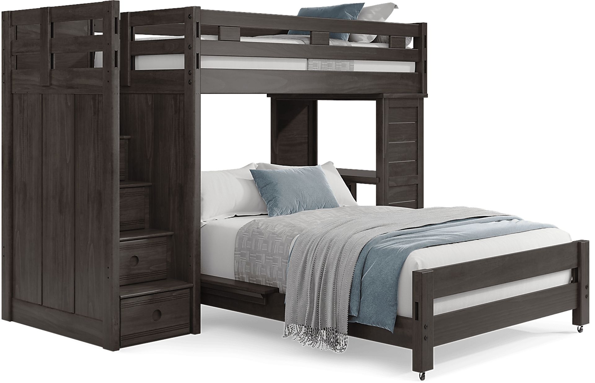 Get a space saving solution without sparing on timeless style appeal when you choose the Creekside 2.0 loft for your child's room. Crafted of pine solids and veneers in charcoal finish, this twin bed sits atop a loft that features a desk affixed onto the frame with five steps configured onto the opposite end for easy-peasy ups and downs to and from bed. Additionally, four of the steps have drawers to help store away your child's favorite things. Just beneath the top bed, a full-size caster bed offers an additional place for sleep. Mattresses and foundations sold separately. This product requires a bunkie board (sold separately).